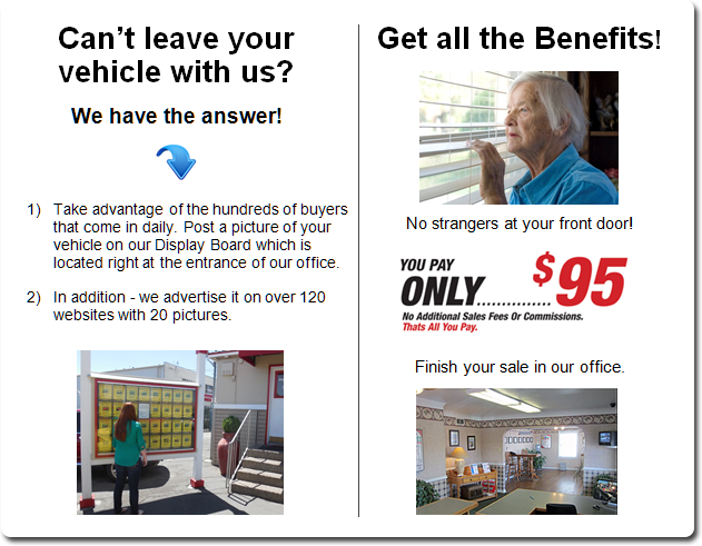 Our best advertising is our long-standing reputation, over 30 years, for serving the Reno community with honesty and professionalism. We cut out the middleman and pass the savings on to you. This is a win-win situation. Our display lot and your car are physically advertised to over 26,000 people who drive by daily on Mill Street, in addition to the freeway exposure. Hundreds of those potential buyers walk through our lot every day to see the new arrivals that come in daily and then compete with each other to buy your vehicle. Another advertising method is our Waiting List. When a car comes in that they are interested in, we call them immediately. This is why we have so many cars that sell within 10 days.